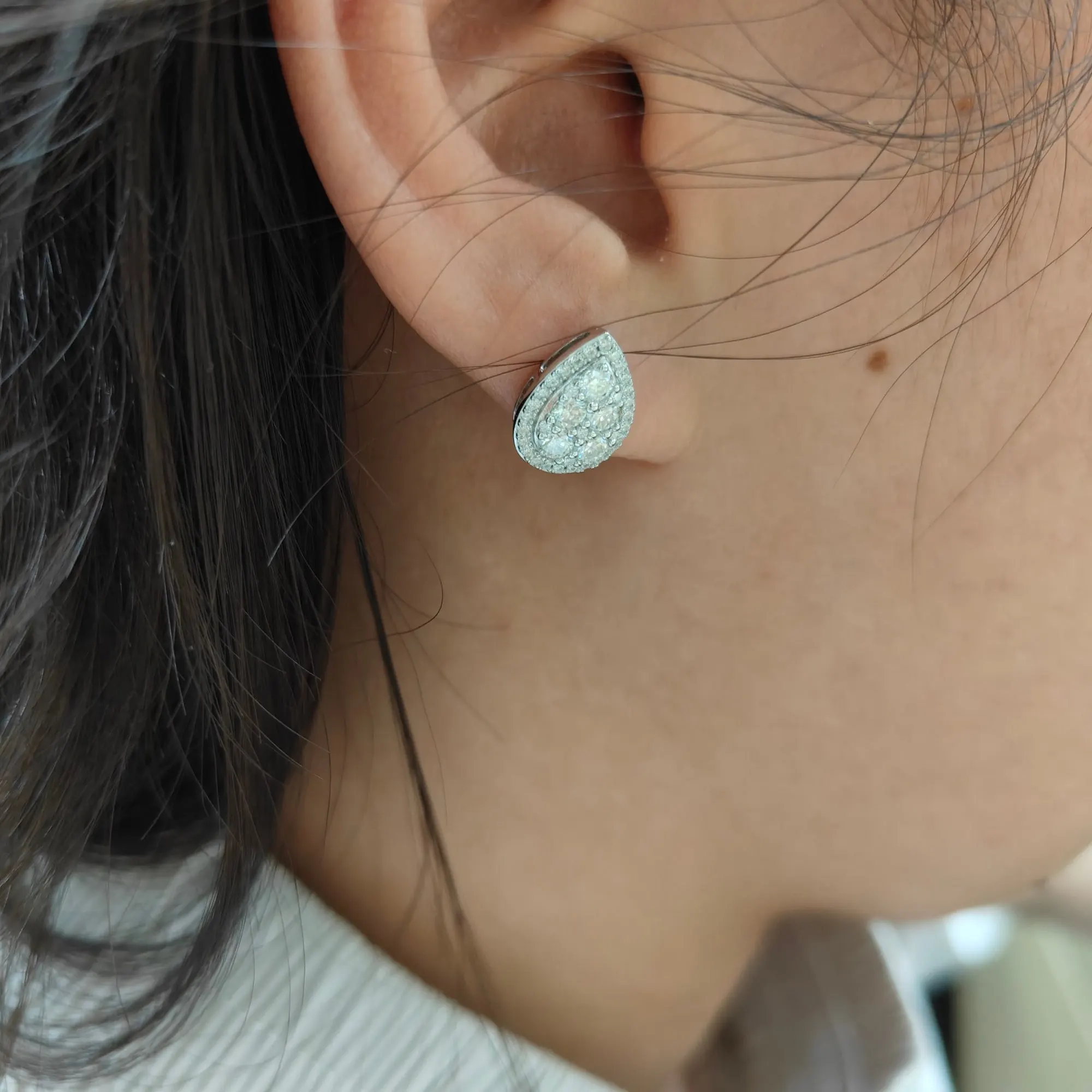 Each pair features a shimmering halo around a waterdrop center moissanite, creating a glowing silhouette that captures light with every movement.