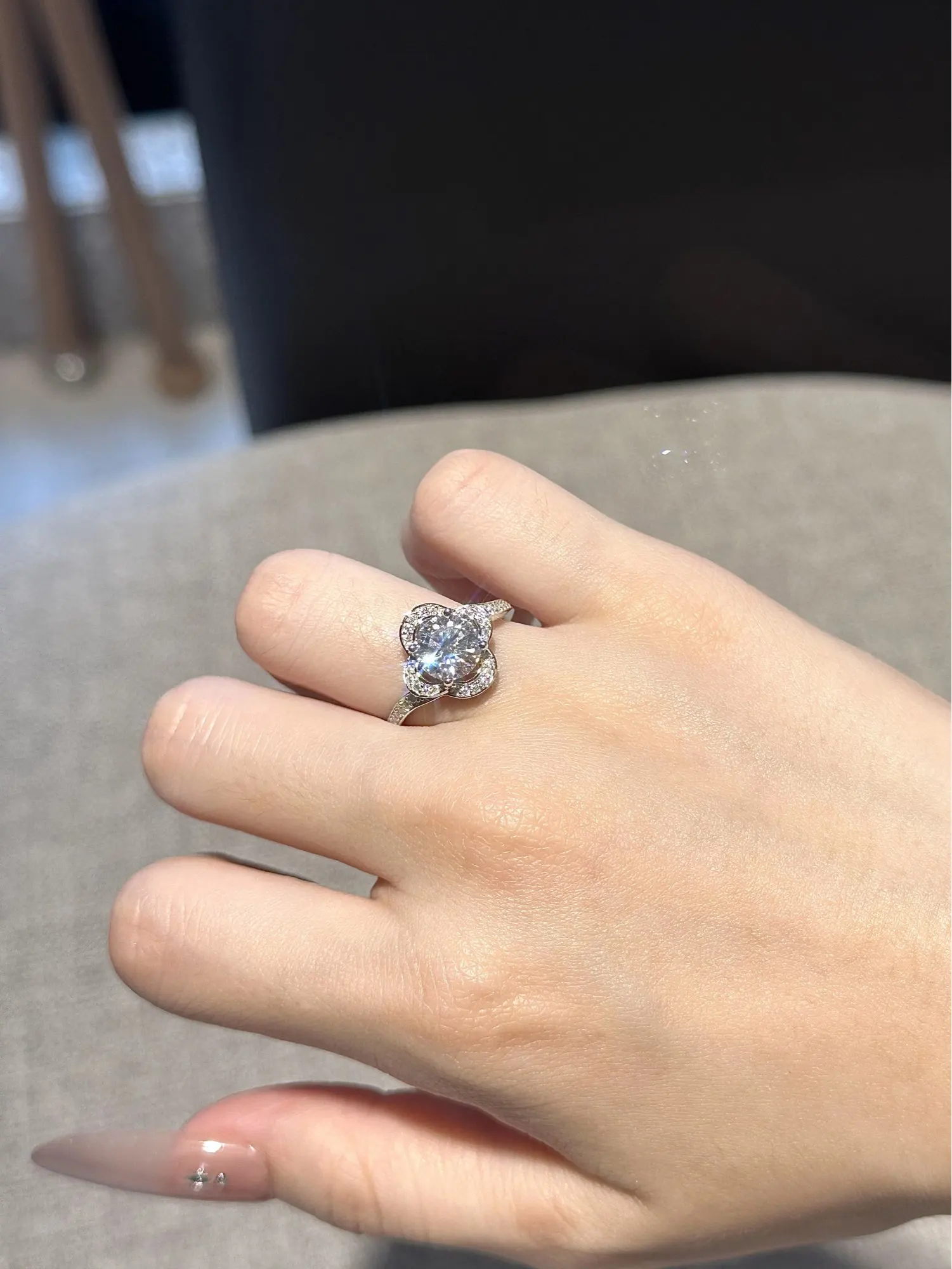 The Eternal Bloom Ring is where timeless elegance meets modern brilliance. At its heart lies a dazzling 7.5mm, 1.5ct D Color VVS1 Moissanite — known for unmatched fire and clarity. Surrounding it, delicate pavé-set stones create a radiant floral silhouette that symbolizes love blossoming forever.