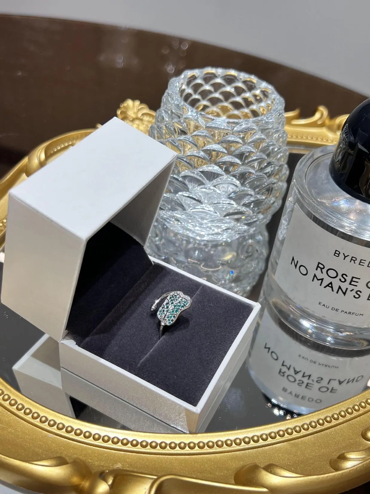 - A unique leaf-inspired design with vibrant green moissanite that symbolizes renewal and harmony.